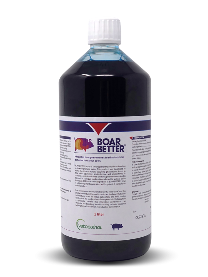 BOARBETTER contains a triple boar saliva pheromone that is a combination of synthetic analogues of three boar pheromone molecules (Androstenone, Androstenol and Quinoline). These act synergistically to trigger the maximal sexual behaviour in oestrus sows, therefore improving heat detection and service rates. It can ensure consistent and reliable exposure to sexual pheromones in your heat detection routine.